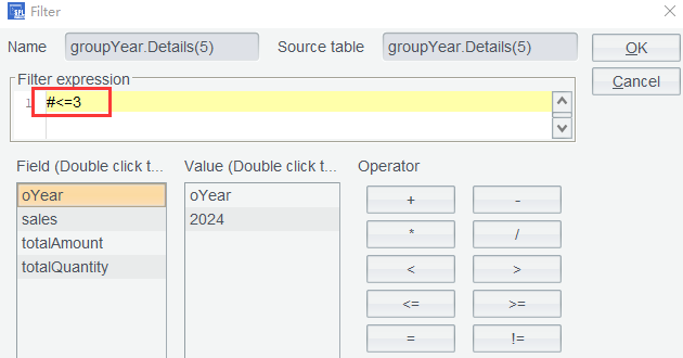 If top() function sorts records by amount ( totalAmount )in ascending order, it gets the bottom 3. So, in the above expression, the opposite direction is specified through -3 (a negative represents the other direction) to get the top 3. Note that semicolon is used here to separate parameters and means returning the whole data rows. You can also use comma to directly return values of the sorting expression. Find more uses about top().