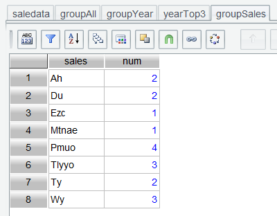 Step 2: As the current groupSales table has a very small number of rows, we can directly find Pmuo, the salesperson who ranked top3 most frequently. If the row count in the table is huge, we need to use expression groupSales.maxp(num) to get the target salesperson.