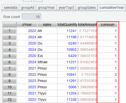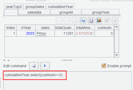 Step 4: Select records meeting condition cumnum>=3. We can perform the filtering operation in the interface or directly using select() function in the Edit Command Zone: