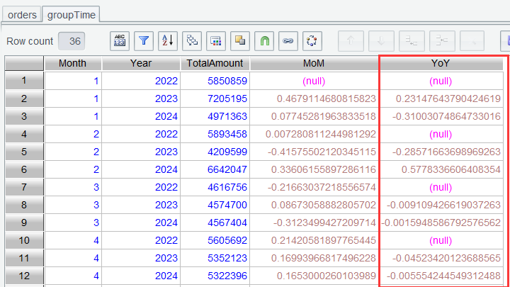 Step 3: Use formula if(Year[-1]==Year-1 && Month[-1]==Month, (TotalAmount-TotalAmount[-1])/TotalAmount[-1], null) to compute YoY growth rate. The formula computes YoY represented by (TotalAmount-TotalAmount[-1])/TotalAmount[-1] when the current pair of neighboring rows belong to the same month and have neighboring years; otherwise, the YoY is null: