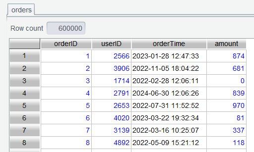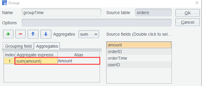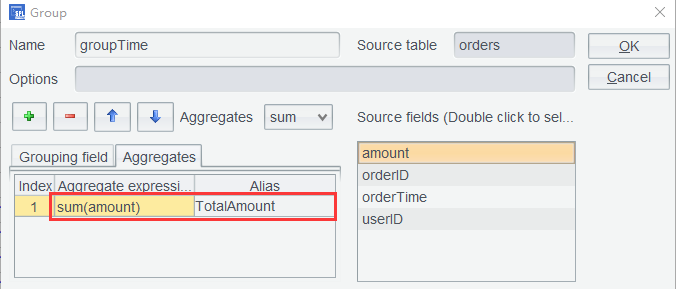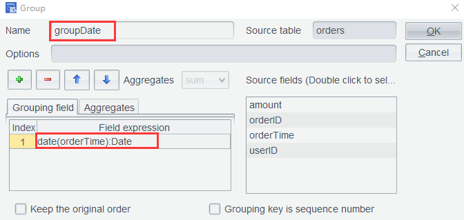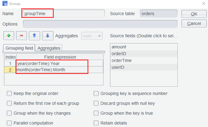 Step 1: Open orders table again and deduplicate records by userID and orderTime. Perform grouping settings as follows: