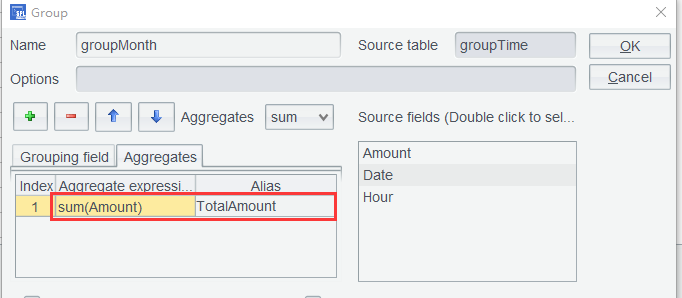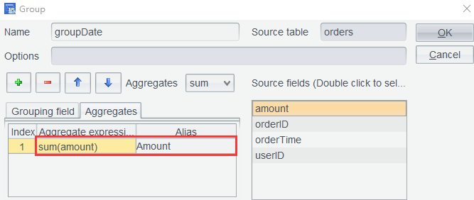 Set aggregate expression to compute sales amount ( Amount ) per day, as the following shows: