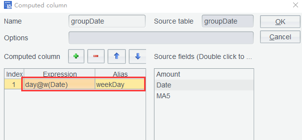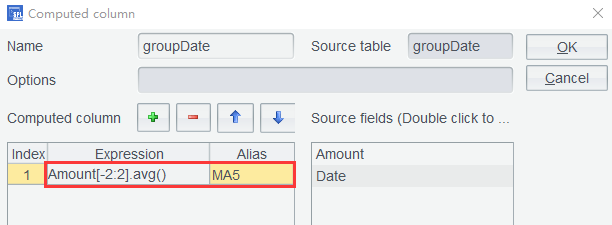 Step 2: Add a Computed Column in groupDate table by setting the expression as Amount[-2:2].avg():