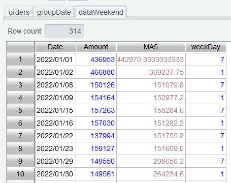 Implementation approach: After rows are grouped by date, find what day each date is, select rows of Sunday and Saturday and those of weekdays respectively, and compute their respective average sales amount to get the comparison result.