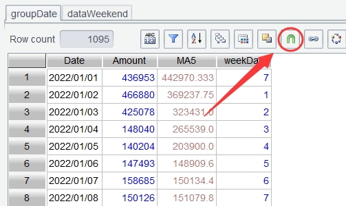 Step 2: Select rows of weekends from table groupDate and perform filtering using expression weekDay==1 || weekDay==7:
