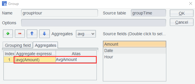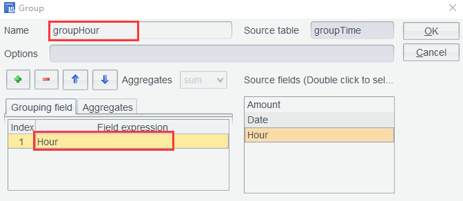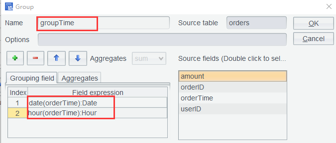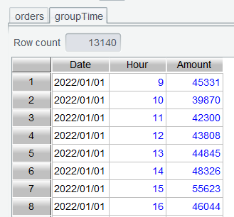 Step 1: Re-open orders table, set grouping expressions date(orderTime):Date and hour(orderTime):Hour in Group window to group rows by the specific time slot for each day:
