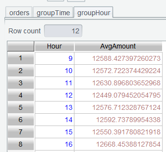 Step 2: Group groupTime table again by Hour field and compute average sales ( AvgAmount ):