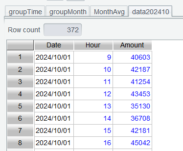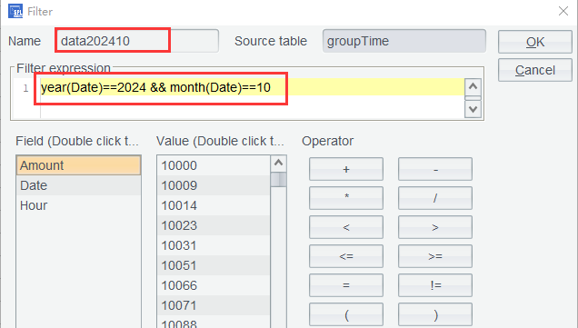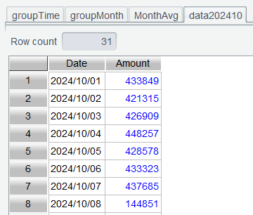Step 3: Select data rows of October 2024 from groupTime by setting filter expression as year(Date)==2024 && month(Date)==10: