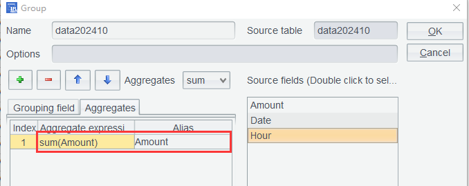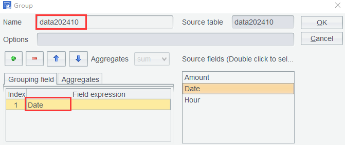 Step 4: Perform aggregation on data202410 by date – again group rows and aggregate by Amount: