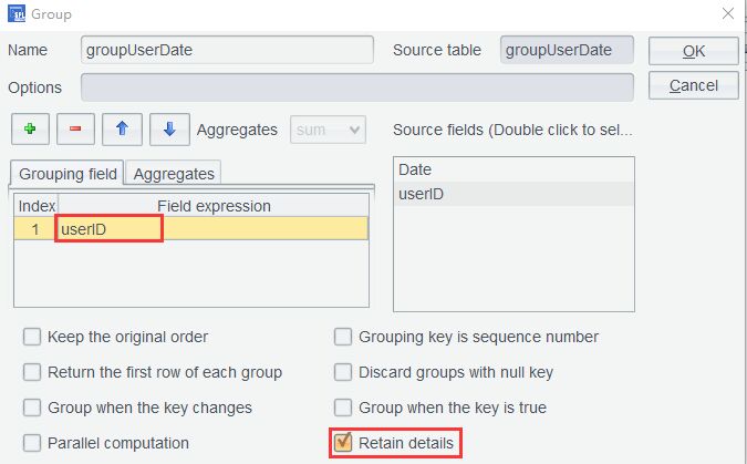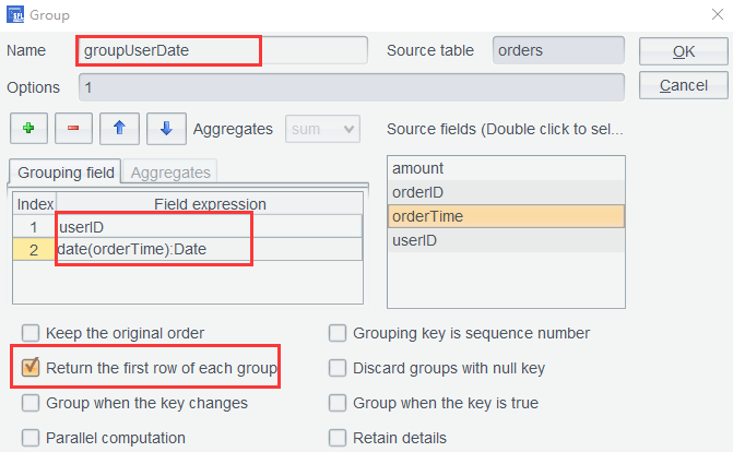 If there are multiple orders in the same day, check Return the first row of each group to remove duplicates. By checking this option, the aggregation becomes meaningless. So, the aggregation settings in the above screenshot are disabled. Click OK to get a table containing user order dates: