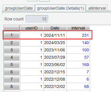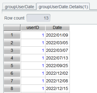 Step 5: Now we find the last purchase data row for each user. Back to groupUserDate.Details(1) , where we use interface-based sorting to sort rows by date in descending order. Note: operations on a details table will be synced to each of the other details tables only when they are performed through icons. If you double-click the column header to sort, only the current details table will be ordered.
