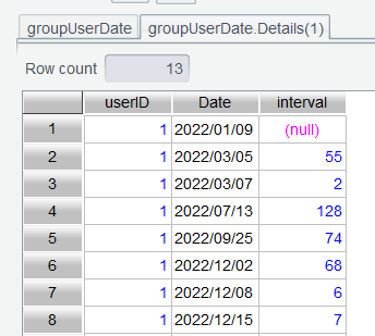 There aren’t any rows before the first data row, so its interval value is null. On the filtering interface we use expression interval!=null to remove this row: