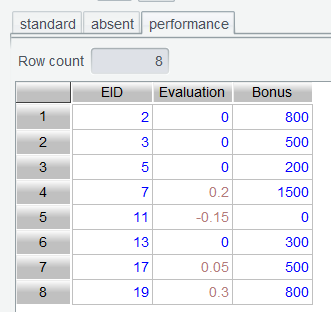 For the current table in this example, only the employee record having a matching record in both the absence table and the performance table appears in the inner join result set. As only some employees have the absence records and only some of them get performance bonus, the join should be based on the left table, which is the employee standard salary table ( standard ) in our join scenario. The number of employees in the joining result set should be the same as that in the table.