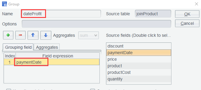 Step 2: Group and compute sales amount by month and by product. In expression month@y(paymentDate), @y option means returning an integer of yyyyMM format: